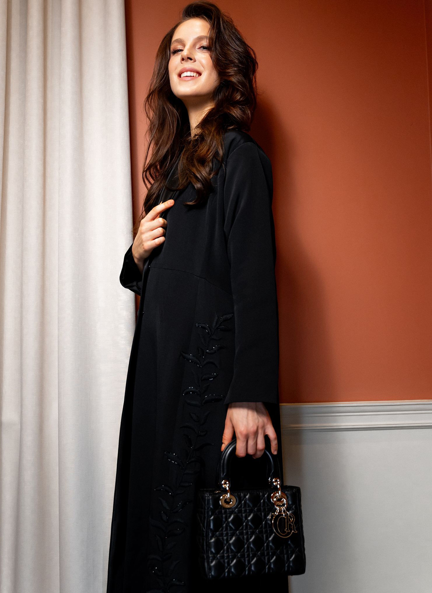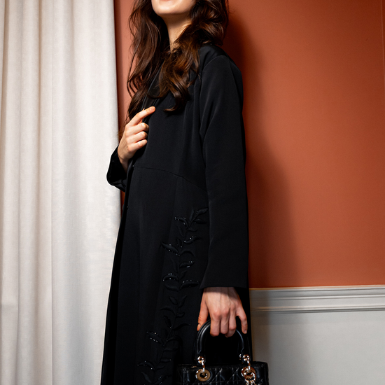 The Sharifa Cut stands as a portrait of composed strength—an abaya shaped with the precision and attitude of classic British power dressing. Its structure is deliberate yet elegant, balancing firm lines with a fluid drape that moves with quiet authority. Crafted from refined silk and tailored with couture-level discipline, the silhouette feels both commanding and effortlessly feminine.